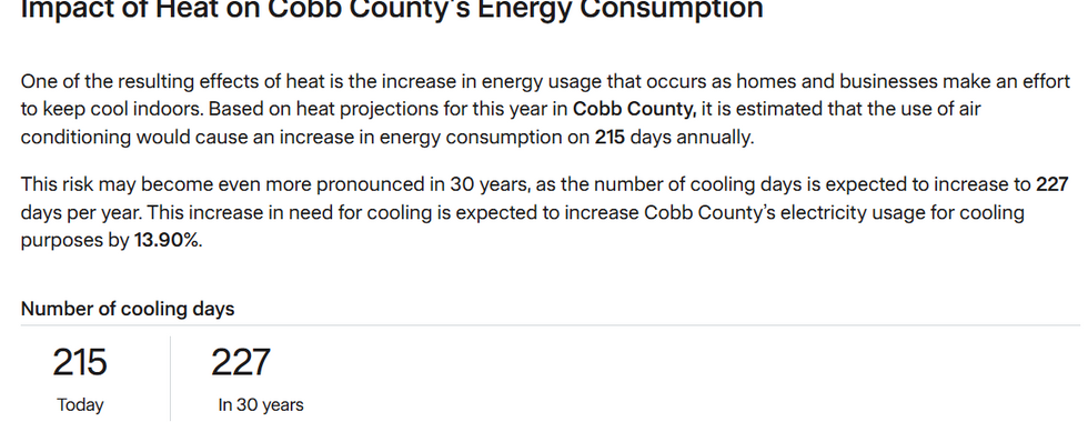 Based on the data found above, I'm convinced that the biggest climate challenge that densely populated Cobb County cities like Marietta, Vinings, and Smyrna experience is the risk of urban heat, especially because these areas are growing and developing at a rate faster than the communities can prepare for them. Rising global temperatures are leading to more frequent and intense heat waves, which are exacerbated by urban development and the urban heat island effect.